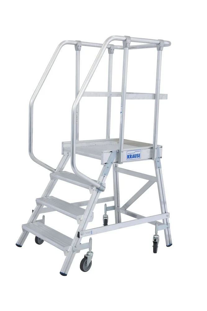 Denna arbetsplattform är gjord av aluminium, vilket gör den hållbar och stabil. Plattformen har hjul som gör den väldigt lätt att transportera, plattformen är även formad så att den kan stå tätt intill hyllor, väggar med mera. Trappan har 4 steg och en höjd på ca 1,95 meter, vilket kan ge dig en arbetshöjd på ca 2,95 meter.