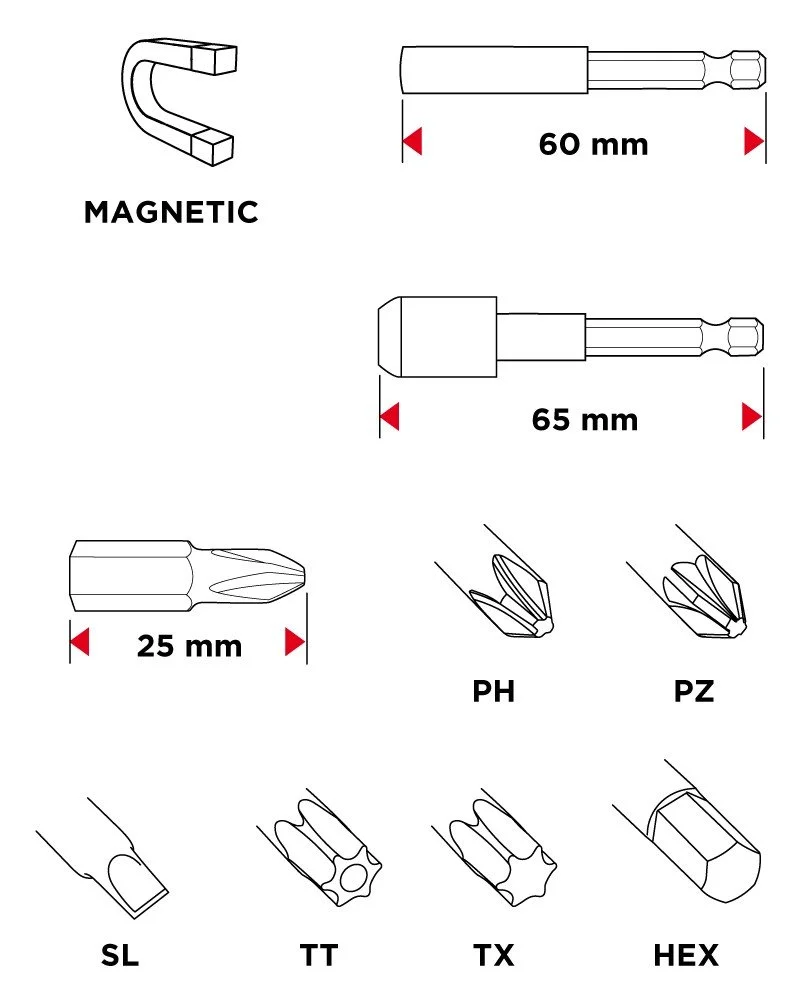 Med två magnetiska hållare, S2-stål, 25 mm – 58 delar.