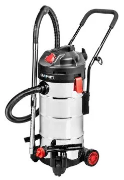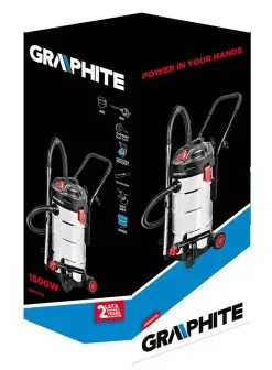 Dammsugaren kan också användas som fläkt. Dessutom är enheten utrustad med flytande säkerhetsventil för våt drift och avtappningsplugg för smutsigt vatten. Stora bakre drivhjul och stöd för framhjulen gör det möjligt att flytta enheten säkert under svåra förhållanden. Koppling i dammsugaren gör det möjligt att ansluta ytterligare elverktyg med maxeffekt på 2000 W. Tre-läges brytare gör att man kan starta dammsugaren med det påkopplade verktyget eller köra den som en fristående enhet. Enheten är utrustad med metallrör med justerbar längd. Extra munstycken förvaras i verktygets basenhet.