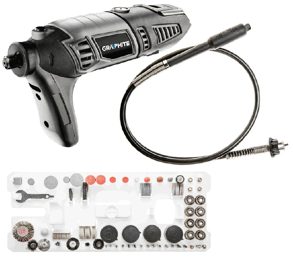 Verktygshållarens skaftdiameter 1,6 mm/2,4 mm/3,2 mm, spindeldiameter M8, maximal verktygsdiameter 35 mm, tillbehör: flexibelt skaft, särskilda platt skruvnyckel, ytterligare skydd, extra handtag, 190 olika tillbehör, vikt 0,75 kg, transportlåda av plast.