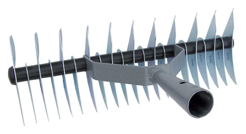 Dubbelsidig räfsa för luftning av jorden. Bredd 34 cm