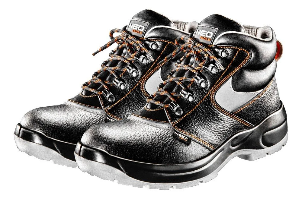 Sula med halkskydd och stötdämpande system, motståndskraftig mot nötning, olja, bensin och andra organiska lösningsmedel, stålhätta klarar upp till 200 J påverkan, metallinlägg, anti-elektrostatiska inlägg, metallöglor, reflexdetaljer, kategori S1P SRA (SRA – halkskydd på ett keramiskt golv täckt med en lösning av natriumdodecylsulfat (SLS)), CE-certifikat