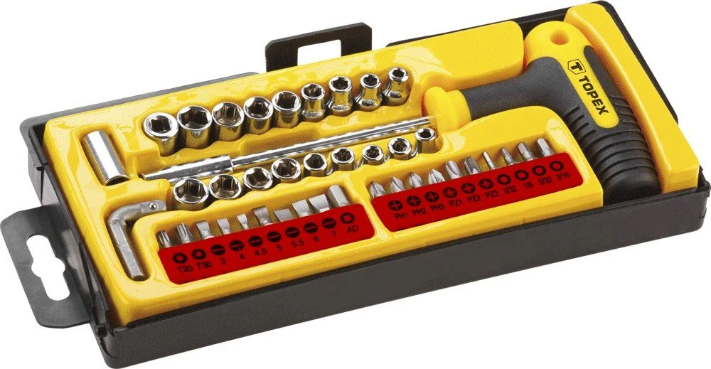 Bits tillverkade i tåligt S2-stål, resterande delar tillverkade i CrV-stål. Sorterat i ett praktiskt plastfodral.