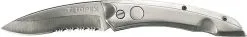 Kniv tillverkad i metall, med nylonfodral. Blad tillverkat i rostfritt stål. Ergonomisk form med bladlås och bältesklämma. Kniven har fjädermekanism som underlättar när knivbladet ska fällas ut.