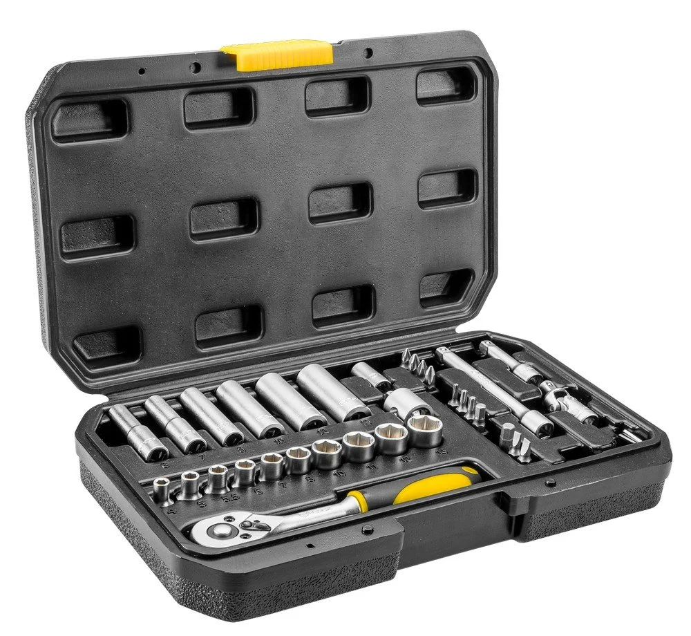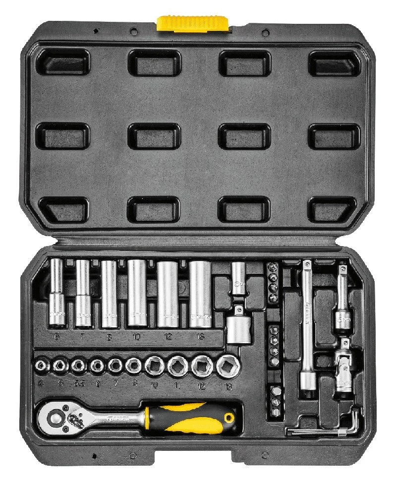 Sats om 36 delar sorterade i en smidig plastlåda. Samtliga delar är tillverkade i högkvalitativt CrV-stål.