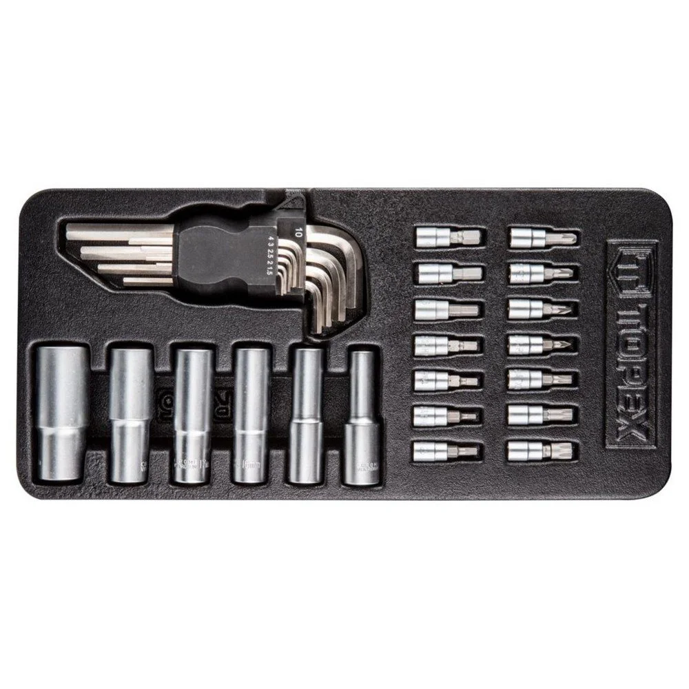 Hylssats med 29 delar, en mångsidig sats för mekaniska uppgifter, med insexnycklar, bits och hylsor. Tillbehören är sorterade i en plasthållare.