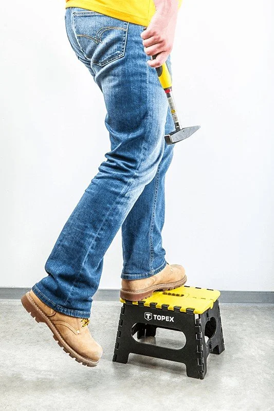 En hopfällbar pall i plast med en maxvikt på 150kg.