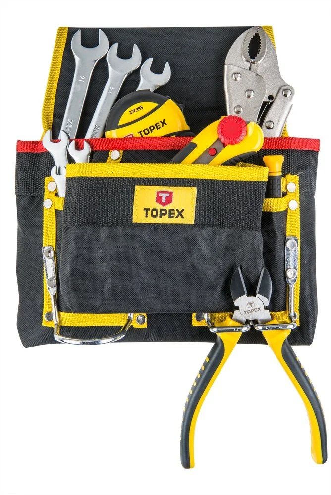 Verktygsficka av slitstark plast med 8 fack och 2 hållare i metall för att hänga verktyg. Passar till bältet i samma serie.
