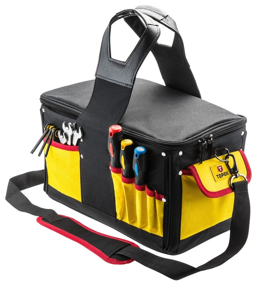 Verktygsväska i slitstark plast med blixtlås. Väskan har 16 fack utanpå och 12 inuti. Den har ett bekvämt slitstarkt handtag och en axelrem.