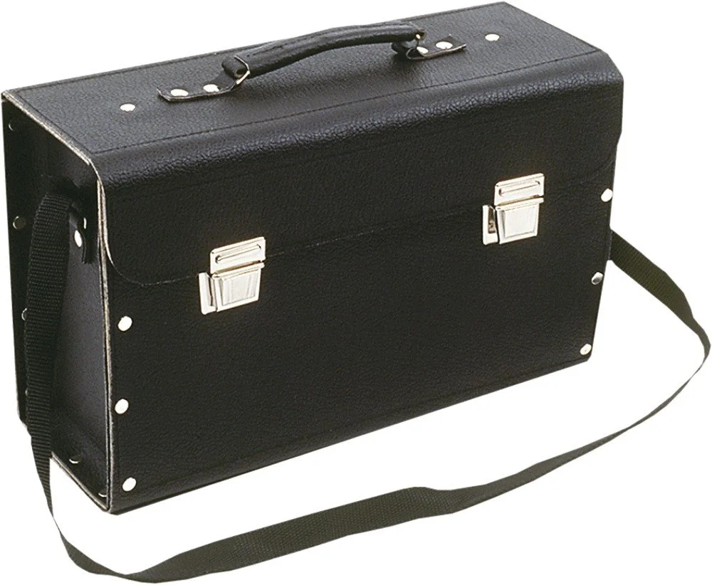 En verktygsväska i läder med förstärkt botten och metallknäppen. Väskan bärs i ett bekvämt handtag eller en axelrem.