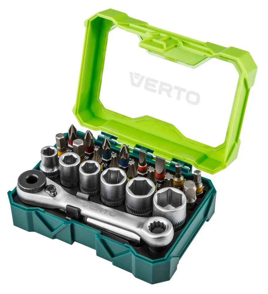24 st 25 mm bits – 2 x PH, 2 x PZ, 2 x SL, 4 x HEX, 5 x TX, hylsor 6 st. + spärrnyckel för bits, magnetisk hållare, hylsadapter (CrV)