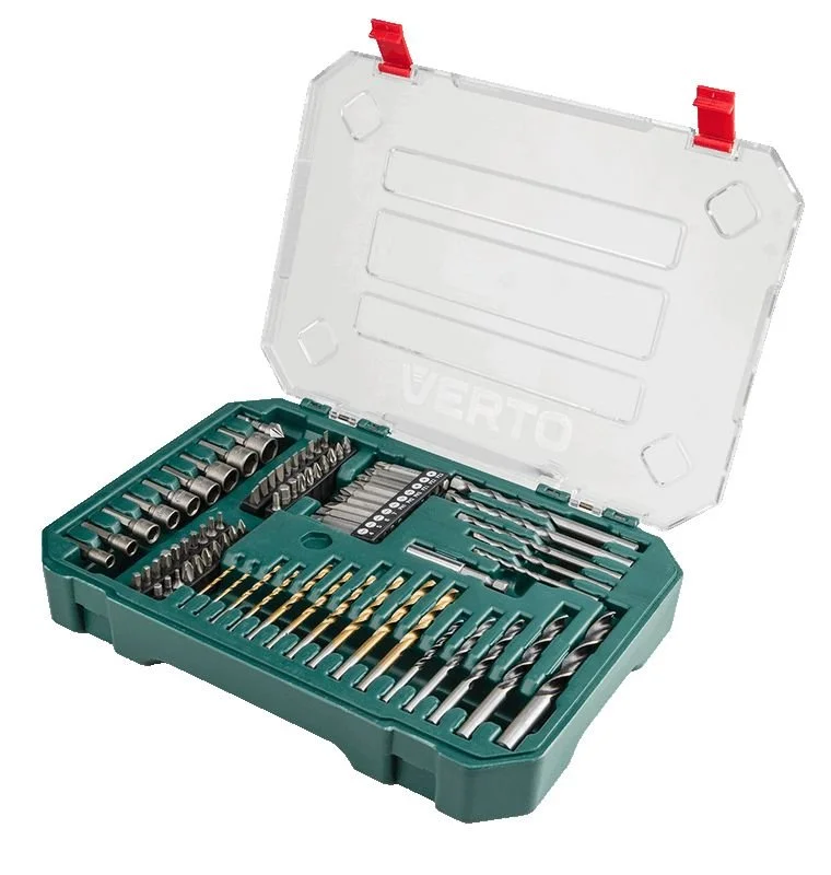 Sats med borr och bits för metall-, trä- och betongarbeten. Sorterat i praktisk låda.