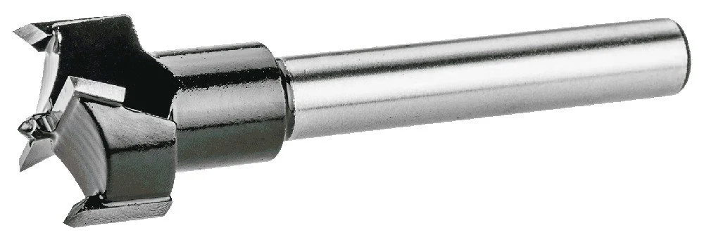 Blad med slipkorn av sintrad hårdmetall ger perfekt ytfinish och förbättrar borrens livstid. Verktyget används främst för borrning av hål för gångjärn i frontpaneler.